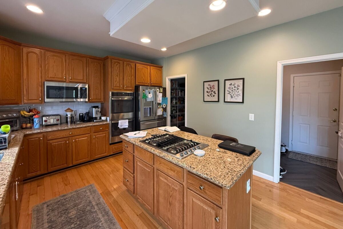 This kitchen was designed to feel both refined and highly functional. The custom range wall makes a statement with its dramatic stone backsplash and professional-grade appliance suite, while warm wood accents soften the space and add balance. An arched doorway leads to a thoughtfully organized pantry—complete with built-in shelving and storage baskets—keeping everyday essentials tucked away but within easy reach. Every detail, from the brass hardware to the layered lighting, ties the clean, classic cabinetry back to the home’s timeless architecture.